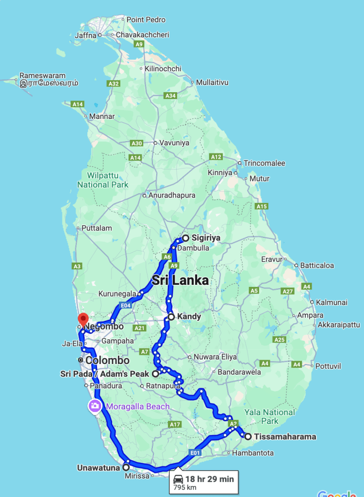 We travelled about 800 kms in 8 day and covered parts of West, Central and Southern Sri Lanka. The airport is in Negombo, 1 hr North of Colombo city. We first headed north-east towards Sigiriya (taking a pitstop at Pinnawala Elephant Orphanage) and then came south to Kandy via Dambulla. From here, we headed further South to Adam’s Peak which comes in the hill station/ tea garden region of Nuwara Eliya. Going South-East from here, we reached Tissamaharama (gateway to Yala National Park). Then, we headed West along the coast covering places like Mirissa, Weligama, Unawatuna and Galle. From here, we headed North, again along the coast, covering Hikkaduwa, Bentota and finally reaching Colombo. We headed to Negombo to catch our returning flight.