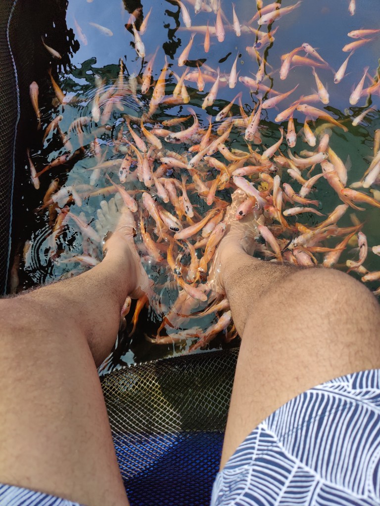 We started the day with a mangrove boat tour in the Bentota backwaters—a short activity lasting about 60 minutes. The tour began with a ride through the meandering mangrove waters, which provided a decent sight. The mangroves weren’t particularly dense, so the guides took us through narrow passages to give the illusion of density. From the mangroves, we were taken to a small village that has been cultivating cinnamon for ages. They provided us with an informative session on how cinnamon is grown there and the quality of their products. Some of us purchased cinnamon souvenirs from the village. Afterward, we visited a natural fish pedicure pond, concluding our mangrove forest experience.
