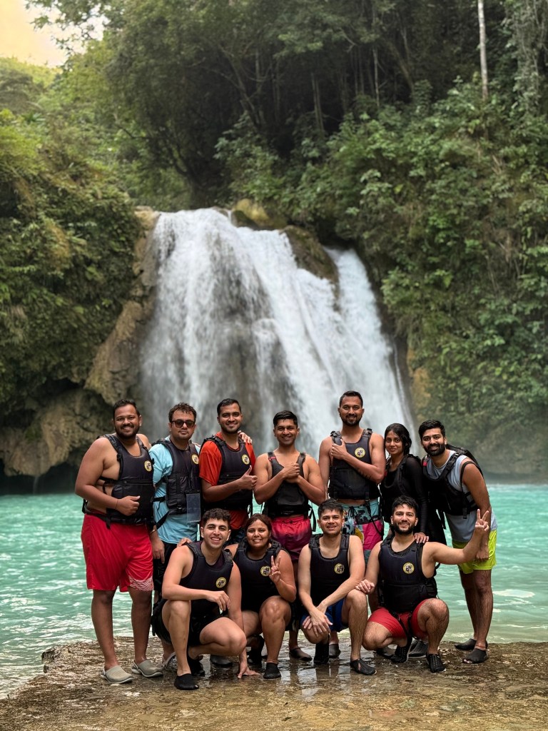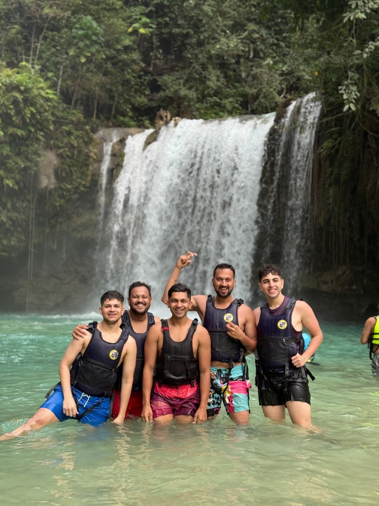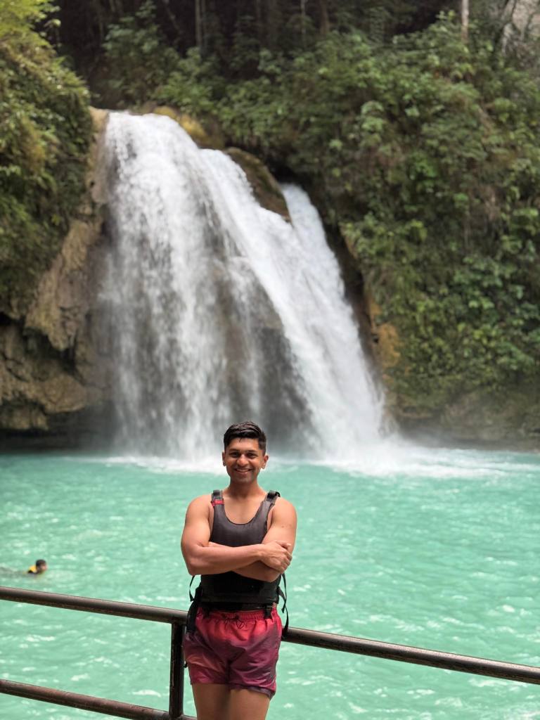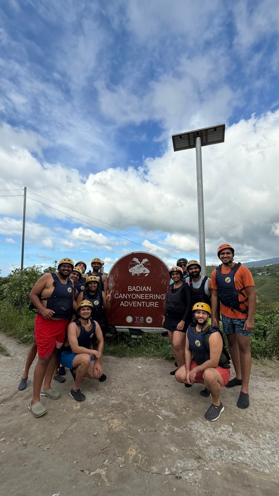 After this, we went back into Moalboal town for brunch at a veg/vegan-friendly café (I’ve forgotten the exact name, but it had lots of plant-based options). Once we’d refuelled, we drove about an hour to Badian, where the famous Kawasan Falls canyoneering starts. This, for me, was the single best experience of my life so far. On arrival, everyone signs a waiver, puts on helmets and compulsory life jackets, and gets ready to be in the water for a few hours.