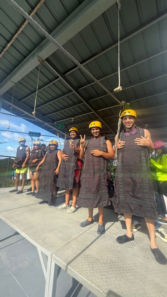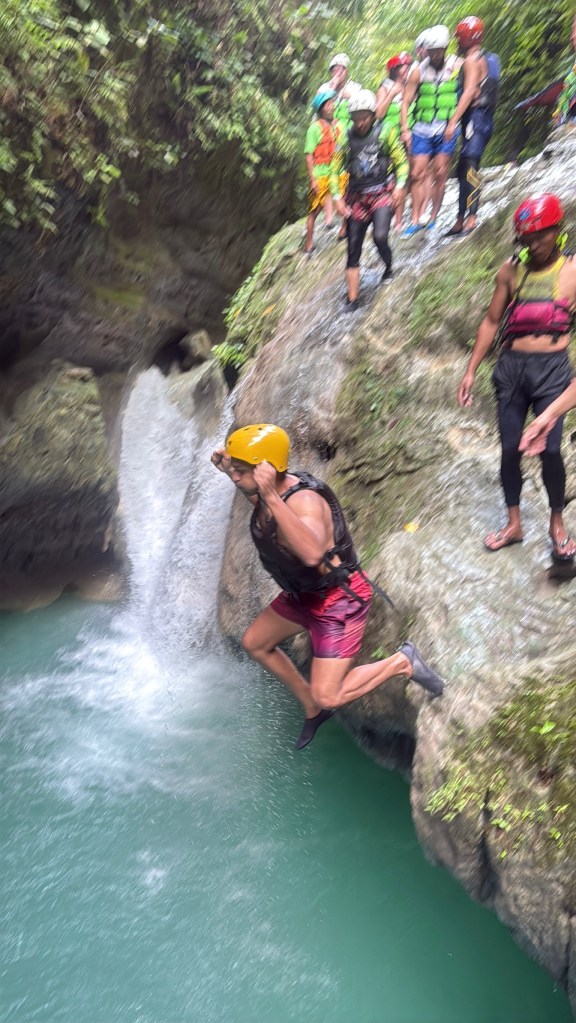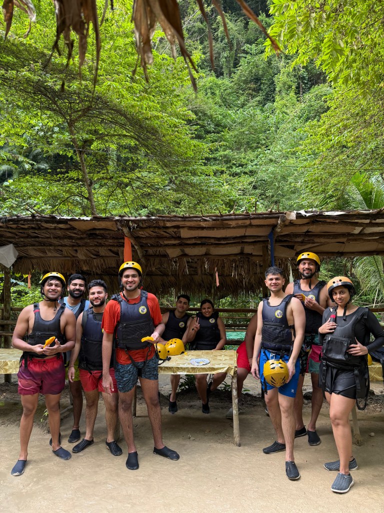 There’s a walk to the starting point, but we chose to take the zipline instead — and I highly recommend it. It costs around 650 pesos per person, is decently long, and saves almost an hour of trekking. It’s not a seated zipline; you lie face-down “Superman style” and go in pairs, with three lines running side by side so six people can go at once. You fly above the forest and river, and it’s a thrilling, but very safe, way to kick off the adventure. From the zipline landing, there’s a 20–30 minute walk down to where the actual canyoning begins.