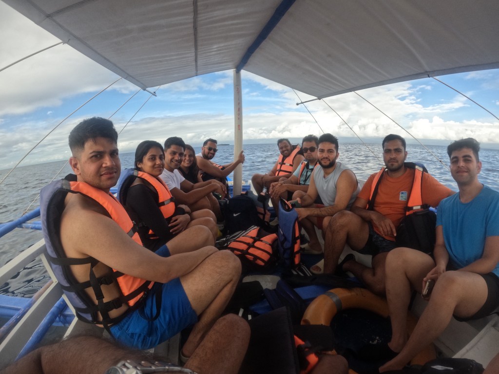 27th December was my favourite day of the entire trip — the kind of day that makes you feel, “Okay, this is why I travel.” We had a painfully early 4 am pickup from our Marvel mansion in Cebu City for a tour we’d pre-booked. None of us bothered with showers or getting ready properly; we just rolled out of bed, grabbed our stuff, and got into the van. It’s about a 2.5-hour drive to Moalboal, a small coastal town that feels nothing like a city — cute, laid-back, with a few cafés and enough vegetarian options, but full of dive shops and ocean energy.