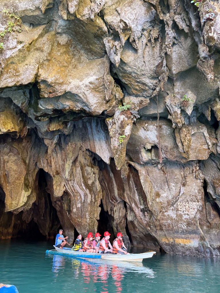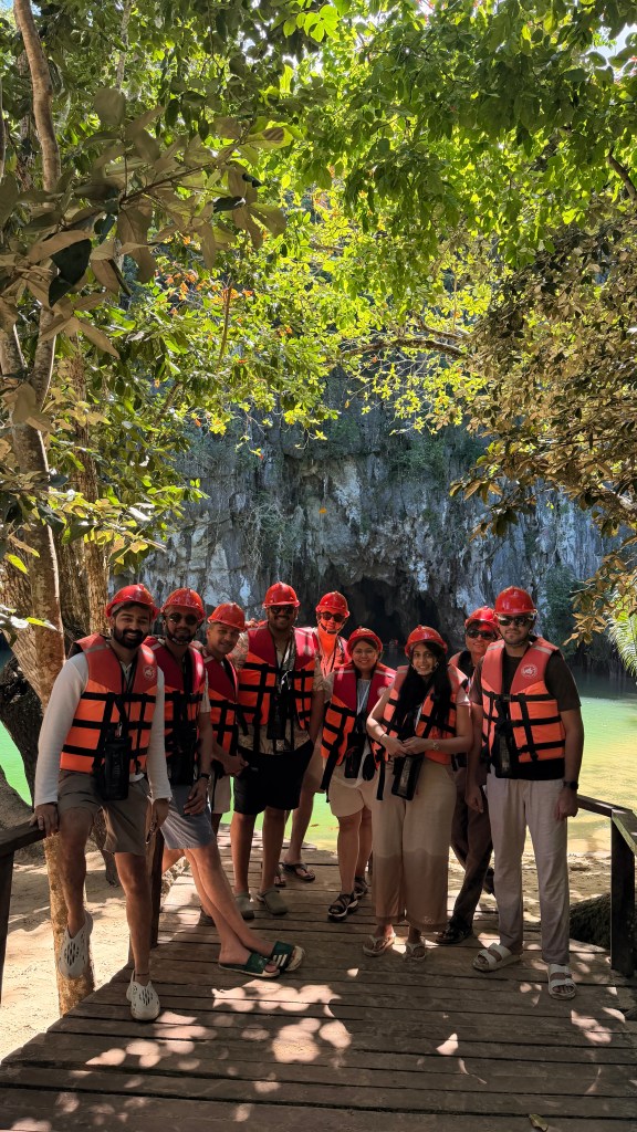 The Puerto Princesa Underground River is often listed among the “new seven wonders of nature,” and we were quite excited to tick it off, especially since we were anyway in Palawan. From the main pier, a small traditional boat takes you to the protected area. Our guide handled all the permits and tickets we’d booked online beforehand, so we just followed along. Once you land at the conservation area, there’s a short 10-minute walk through a forest trail to reach the cave entrance. Here, everyone is given helmets and a small audio device with a pre-recorded guide that hangs around your neck.