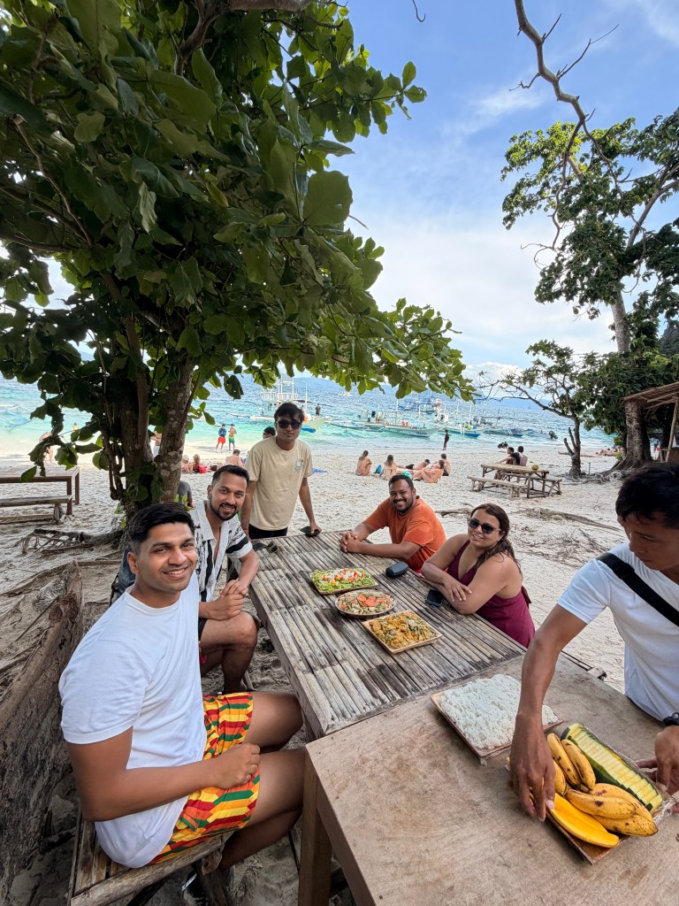 Lunch that day was served at a beach stop, and this setup felt nicer than the previous day. The beach itself was very clean, with basic shacks and rental tables. Nothing in the Philippines felt overpriced — table rentals were quite reasonable, around 100–120 pesos for large tables that easily fit 4–8 people. Lunch was again part of the tour: similar buffet-style food as the previous day, with rice, vegetable curries, and fruits, but with a slightly different veg curry this time. You can either bring your own snacks or buy drinks and extras from the beach shacks.