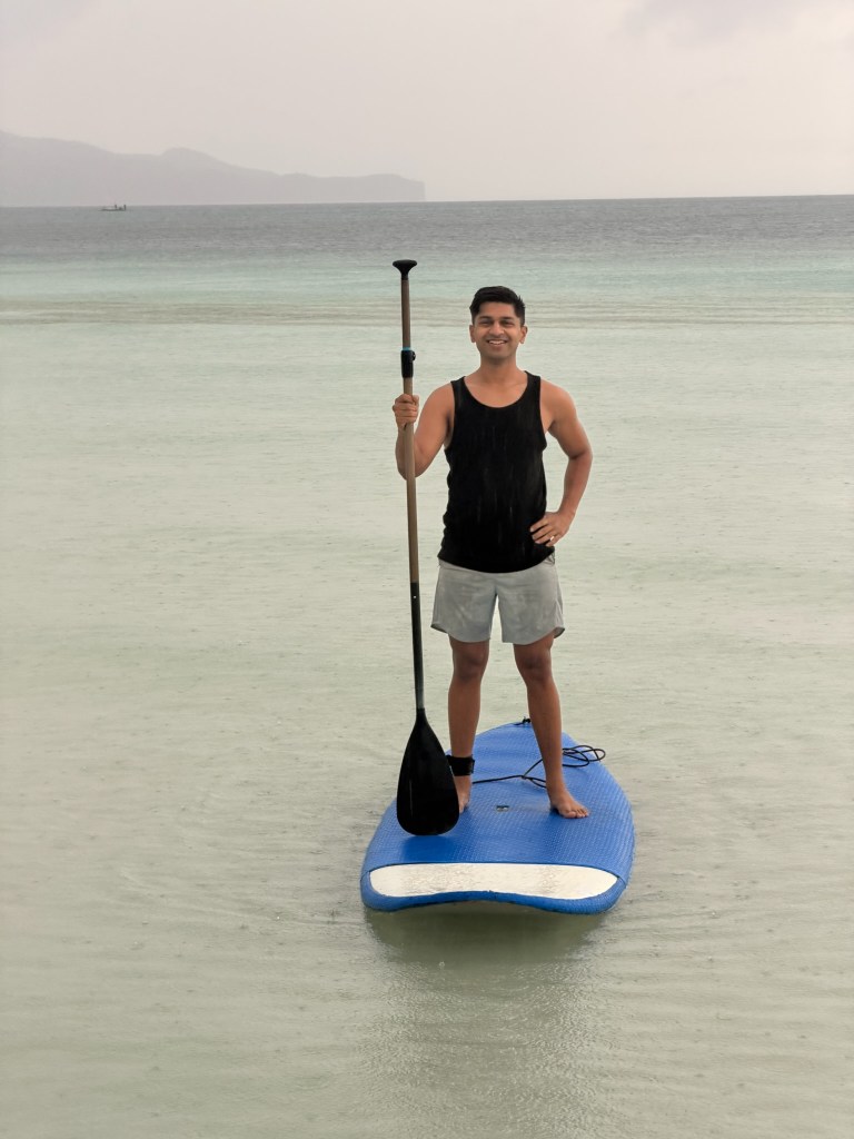 31st December started with a little “last chance” moment. A couple of us woke up early for stand-up paddleboarding (SUP) on White Beach, because we hadn’t done it yet and didn’t want to leave Boracay without that experience. Gliding on completely calm water that barely had any waves, over clear shallows and soft seaweed beds, felt like floating on glass. The sand here is unreal — so soft and powdery that if you stand still for a few seconds, you can literally feel yourself sinking in.