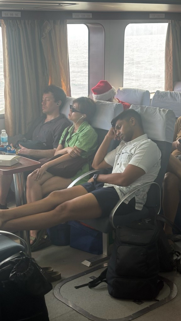 As the boat started moving, it became clear this wasn’t going to be a pleasant ride. There were maybe 200 people on board, and it felt like at least 150 were getting seasick. Staff kept running around handing out vomit bags. A lot of passengers escaped to the upper deck to sit in the open air, hoping the wind would help. Based on that experience, here’s what I’d advise for any long boat journey: